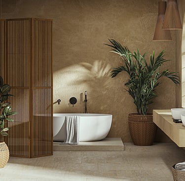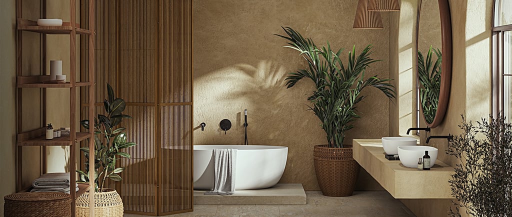 Biophilic design is growing in 2025 — think indoor plants that thrive in humidity, wooden accents, bamboo accessories, and daylight-focused layouts with skylights or large windows.